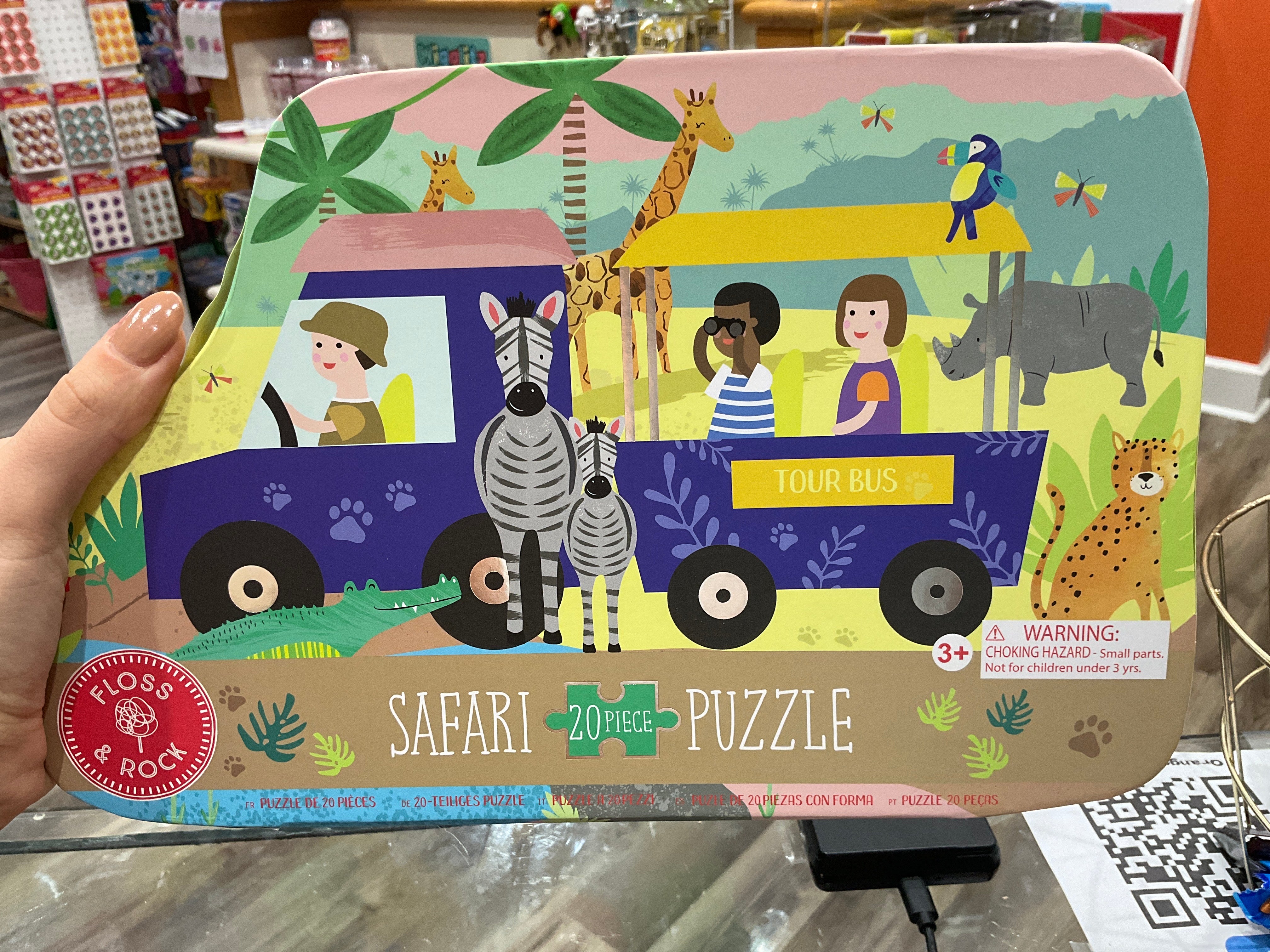This is certainly one of our favourite designs. The box is a fun shape and the puzzle inside is made up of 20 large brightly coloured pieces that make a really cool shaped crocodile puzzle. It’s super long!! Both the puzzle and the box feature shiny foiled details. Suitable for 3+.