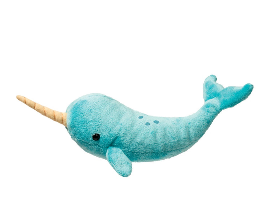 Known as the unicorn of the ocean, the Narwhal is no stranger to the mysteries of the sea and the magic it holds. Our plush Narwhal, Spike, whiles away his time exploring its waters with his friends. This fanciful whale stuffed animal features a bright turquoise color and a handsome spiraled tusk. Soft to the touch and exceptionally cuddly, quality polyester fill within makes Spike a huggable pillow friend. Bubble accents dapple his back while his playful, dark eyes shine with excitement. Maybe you will join him on his next imaginative quest across the sea. Who knows what fun and adventures may lie in store!