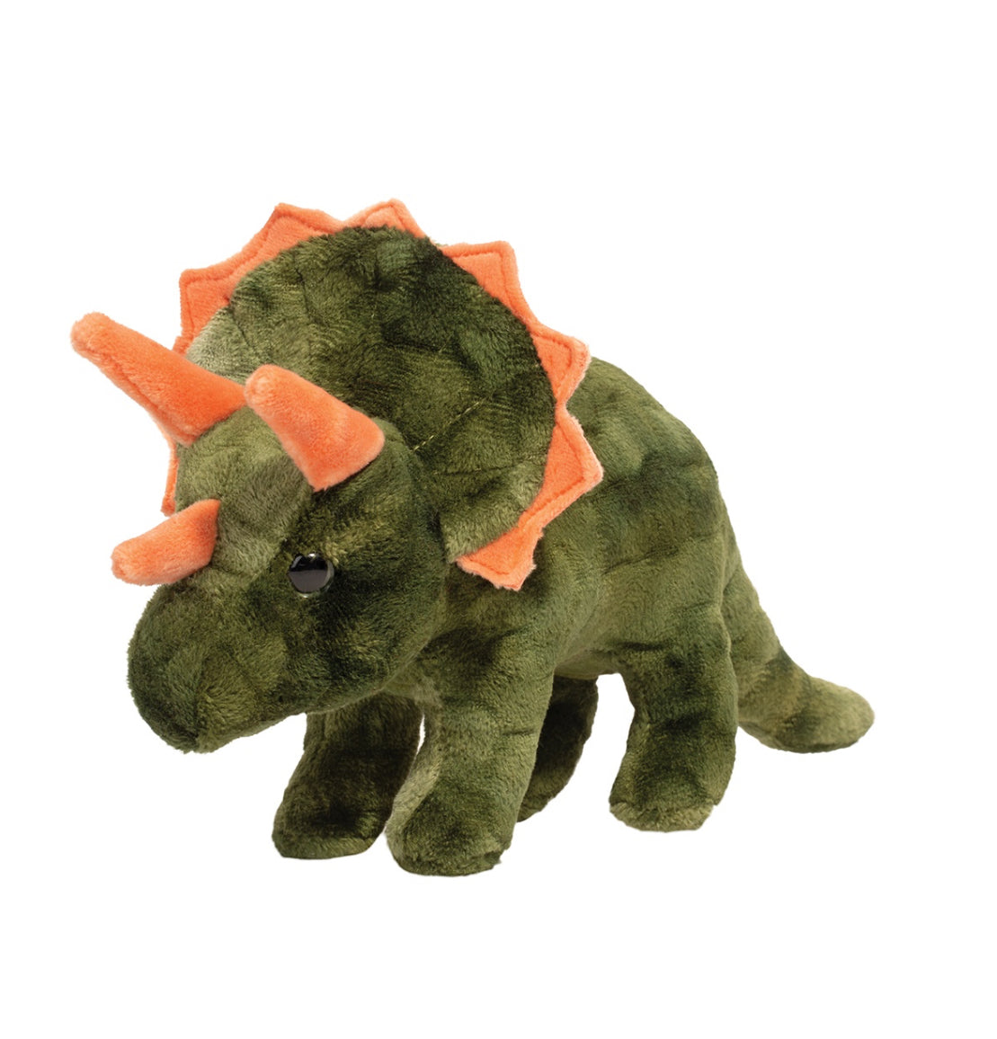 Never one to back down from a challenge, Tops the Triceratops stuffed animal will hold her ground, even when faced with the fiercest T-Rex! A scaly reptilian pattern brings realism to her earthy green plush body, while a vibrant orange color draws the eye to her fringed crest and three facial horns. The lifelike shape of our durable ceratopsian will spark the imagination and promote hours of make-believe play. Squeezably soft but still sturdy enough to stand on her own, Tops is an engaging playmate. Let our dino’s green-eyed gaze carry you back to the leafy jungles of the Cretaceous, Tops will lead the way to big prehistoric fun!