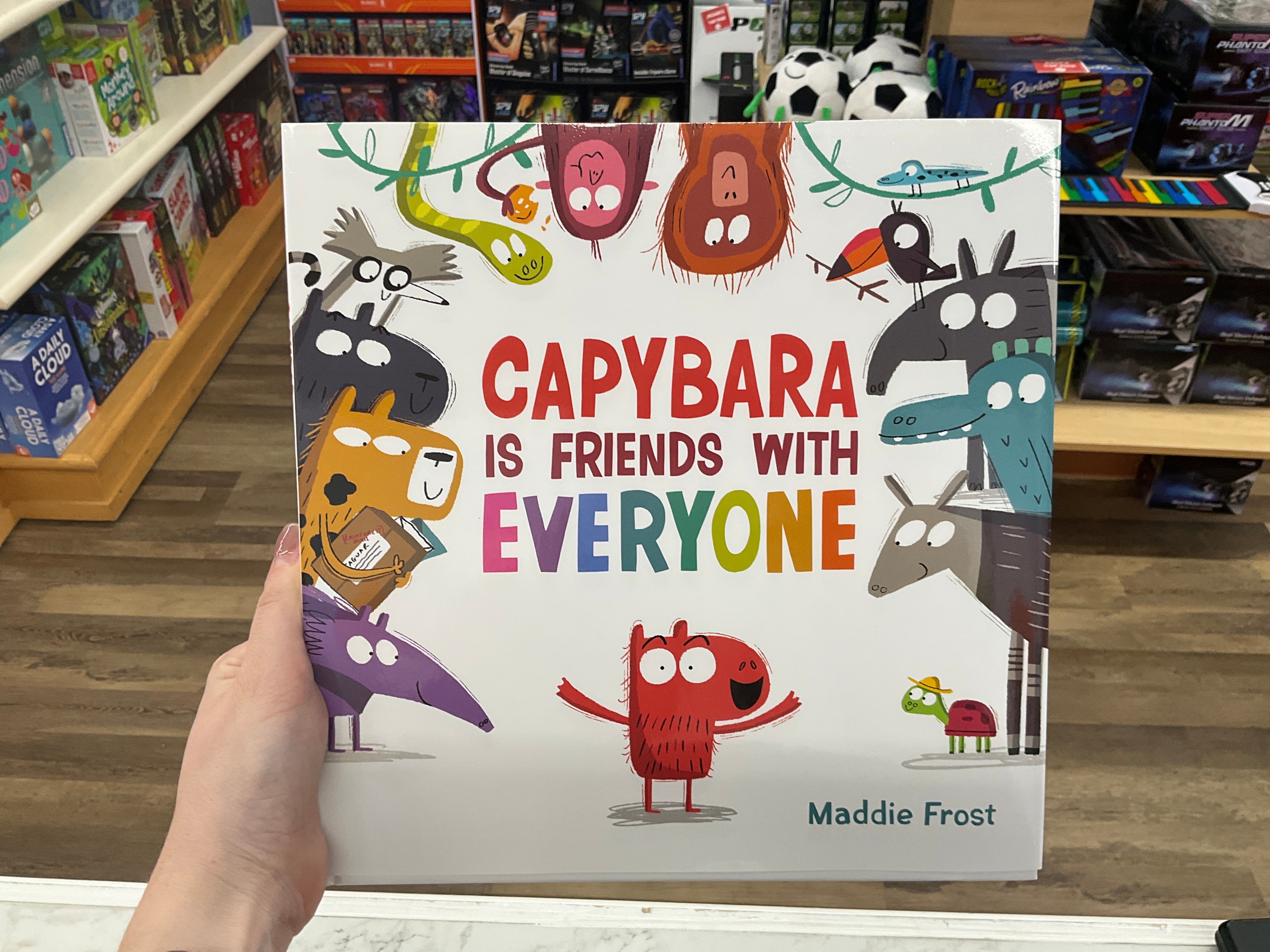 Capybara Is Friends with Everyone is a 2022 children's picture book by Maddie Frost about a capybara who tries too hard to be a good friend, learning a valuable lesson about boundaries and that friends like him for who he is. The story follows the capybara as he goes to exhausting lengths for his many friends, only to discover that a new friend, Sloth, doesn't need all that effort, teaching a lesson on social-emotional learning and friendship