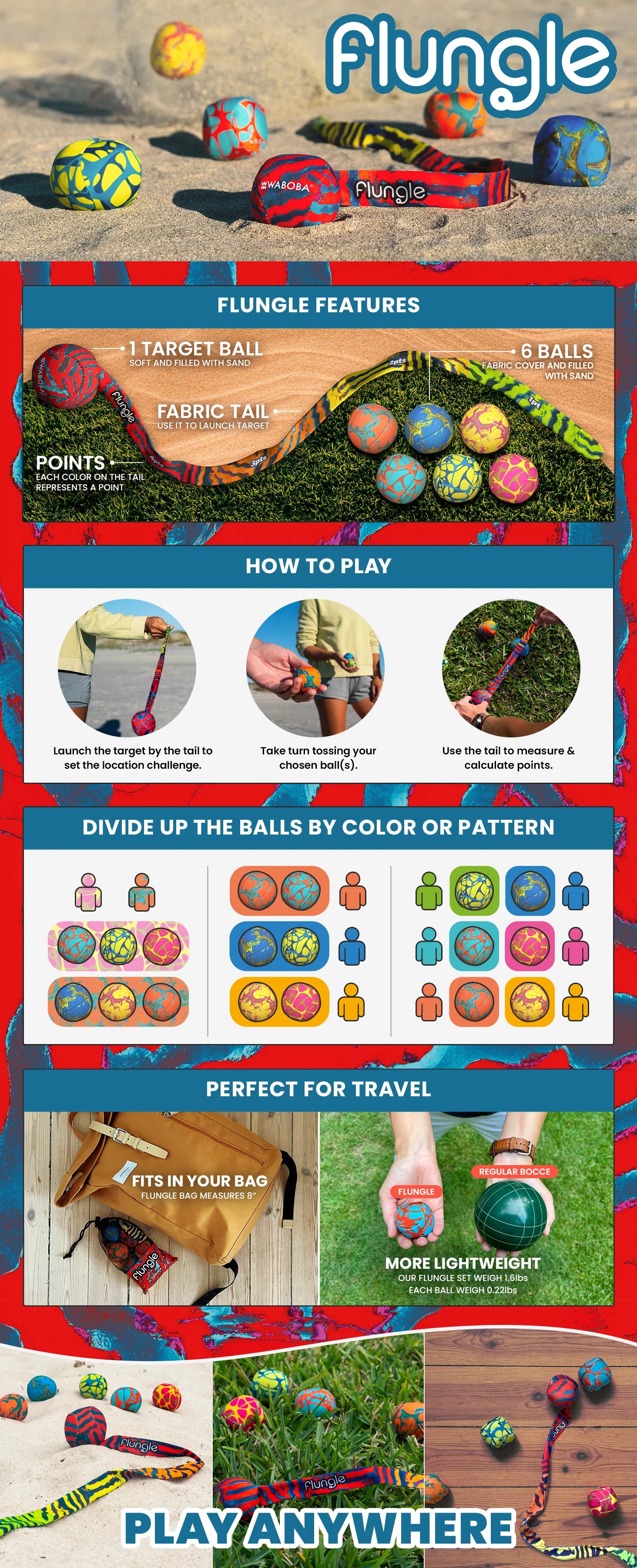 FLUUUUUNGLE! Introducing our new ball toss game with a twist! Flungle features a target you launch by the tail, and 6 sand balls you toss to see who lands closest to it. Use the tail to measure and calculate points. Each color on the tail represents a different point.