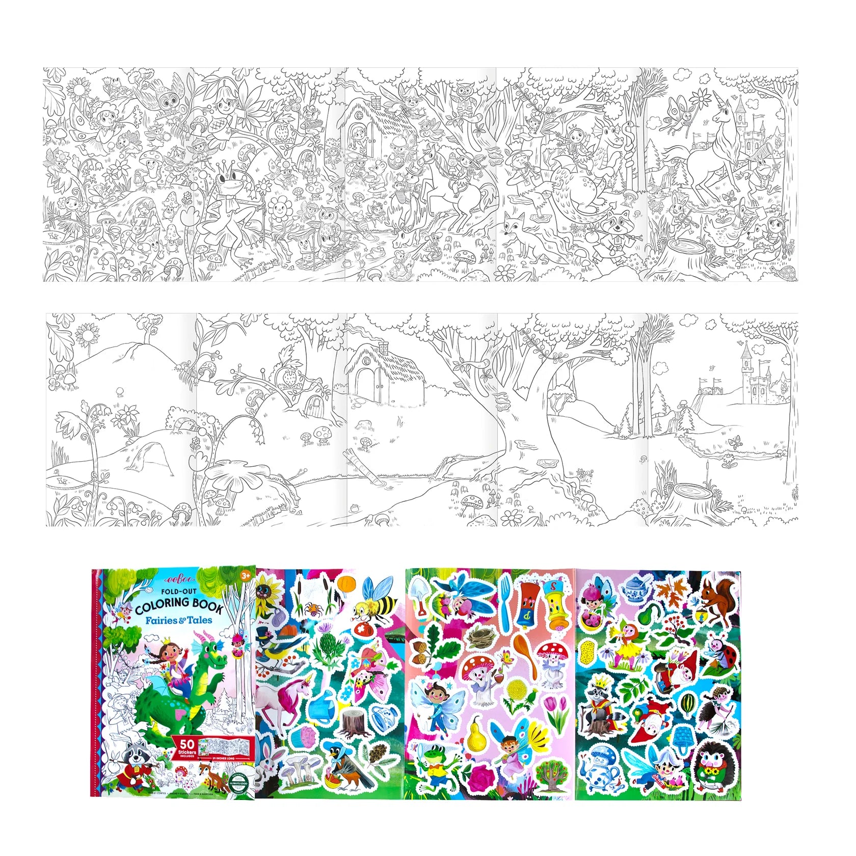 •Fold out coloring mural, front for coloring, back for coloring and stickering; Includes 50 shiny stickers