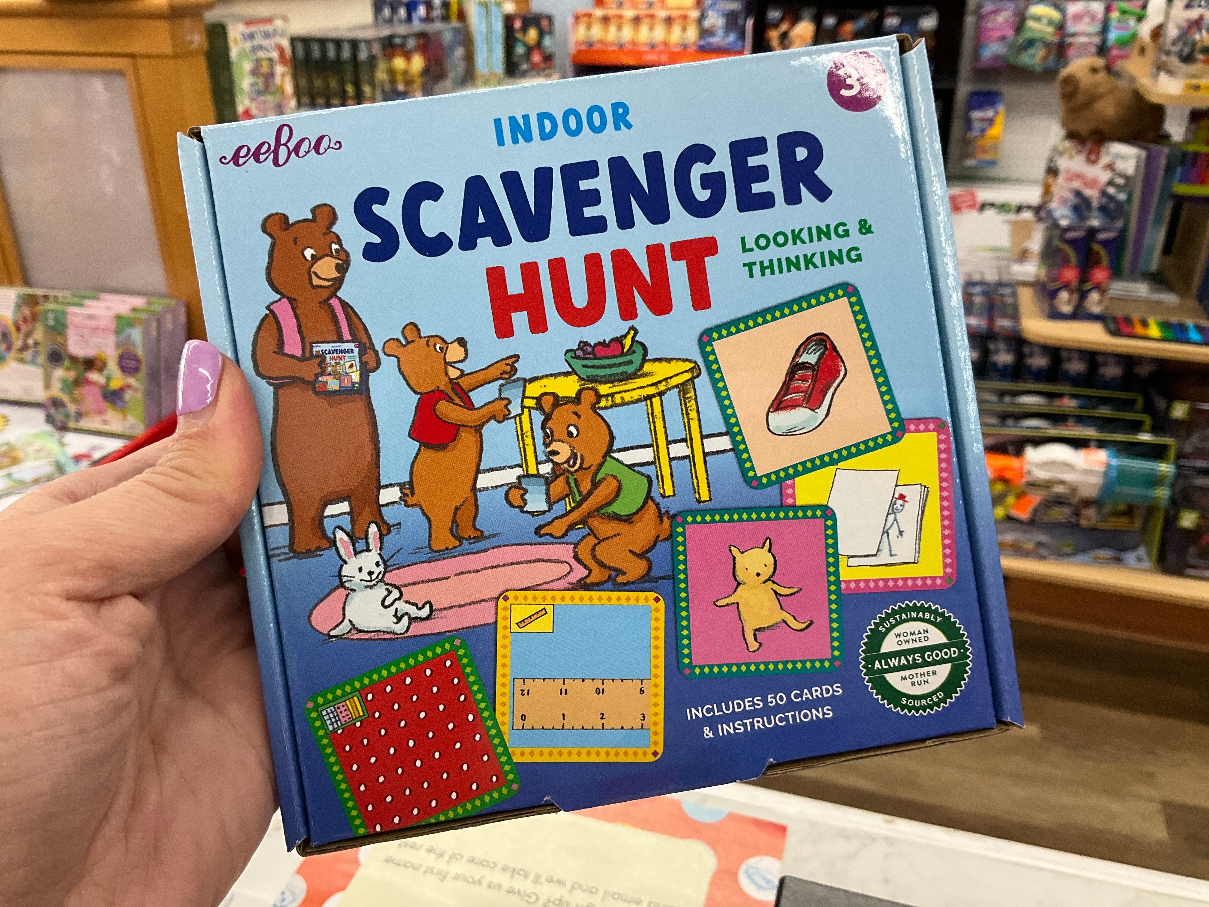 INDOOR SCAVENGER HUNT: Found It! is an exciting Search & Find game that turns everyday spaces into a thrilling adventure! With prompts like “Can you find something with a pattern?” or “Something smaller than your palm?”, kids race to spot objects and shout “FOUND IT!” The first player to collect 7 cards wins!